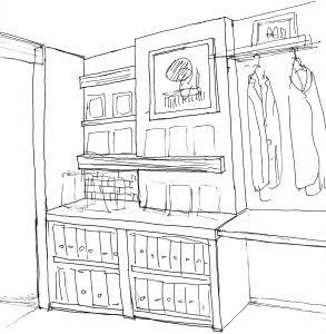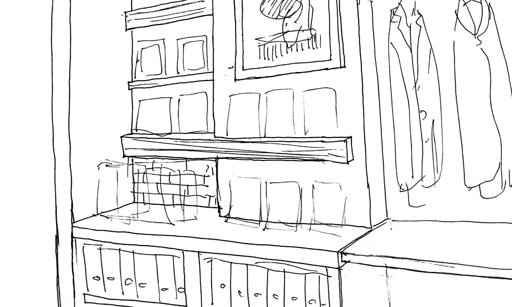 今回は、落ち着いたらとりかかろうと思っている事務所の棚の検討スケッチです。絵に描くのは簡単なのですが、棚をどうやって固定するかが意外と頭を使います。最近はアイアンのブラケットが流行っていますが、インダストリアル的なテイストをあまり出したくないので、なるべく金物は見えないように考えたいと思います。