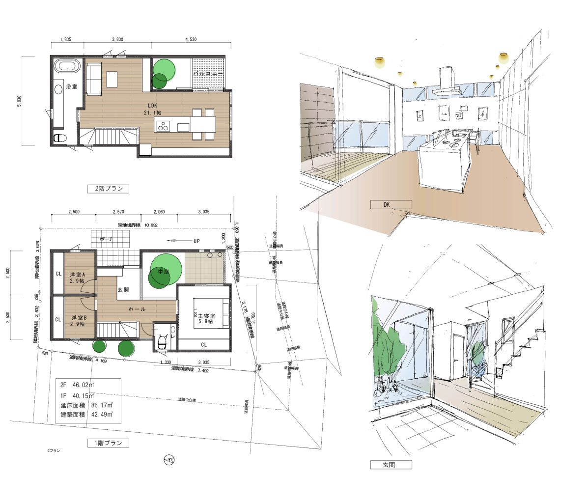 お庭を住まいの一部に取り入れて、コンパクトながらも心地良い住まいを提案するラフプランです。