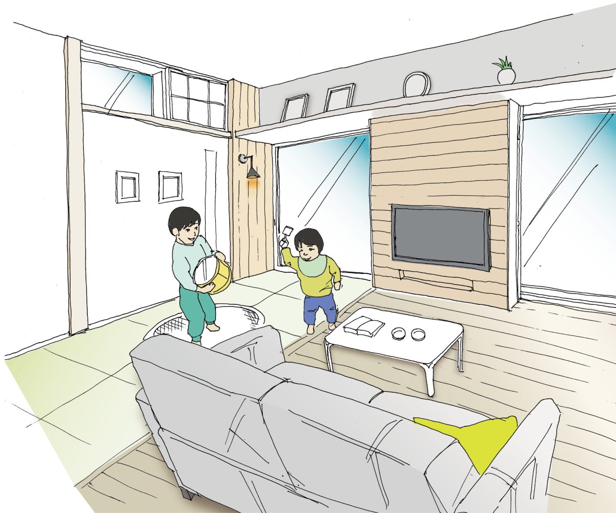 畳コーナーのあるリビングを提案しています。窓前の障子は壁の後ろに収納できます。